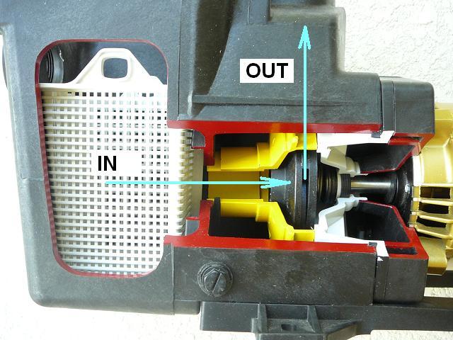 The impeller drives the water from the various drains through the filter and back out to the water inlets.